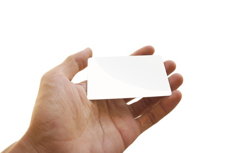 Hand holding blank card isolated on white background