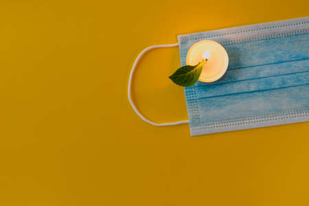 Several blue viral masks on a yellow background with candles on which a green leaf lies