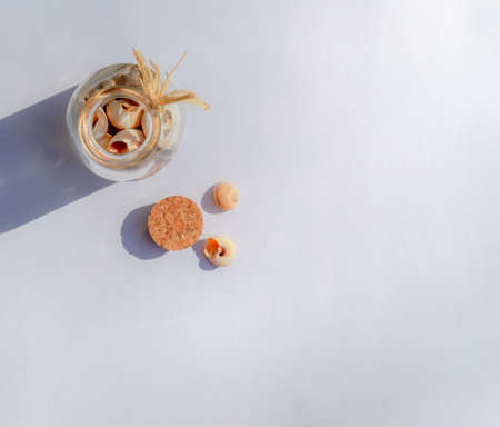 Flat lay photo of sea snail shell in a glass bottle with a cork stopper