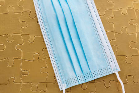 Face mask against gold puzzle pieces reflects concept of pandemic questions and challenges
