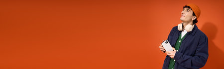 Panoramic banner, portrait of young confident hipster guy wearing denim jacket, round glasses and cap, isolated on background of lush lava color with copy space.