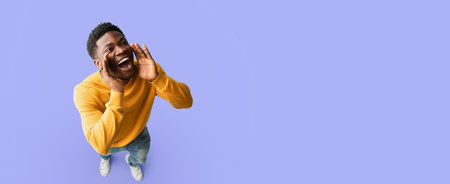 Young Man Expressing Joy While Shouting Happily Against a Purple Background