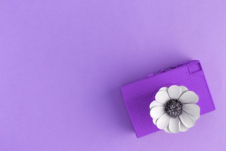 Vintage camera colored in purple with flower in form of lens minimal travel and nature creative concept. Space for copy.