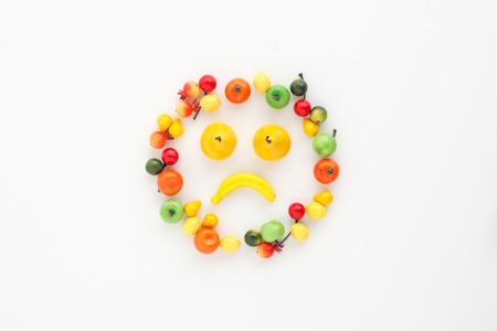 A scattering of many small different fruits on a white background. Emoji sad smile. Minimalism, isolated.