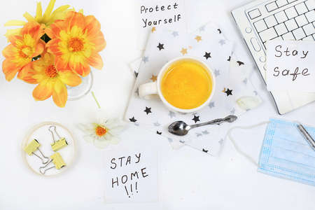 Computer and latte with turmeric on white table, remote work, minimal business concept. Modern woman's work desk. Home office in a pandemic, stay home,