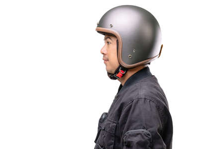 Asia man is wearing bike helmet ready to cycling,isolated on white background