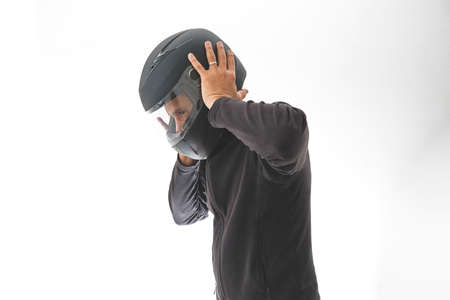 Man with a motorcycle helmet giving a thumbs up gesture, Isolated on white studio wall