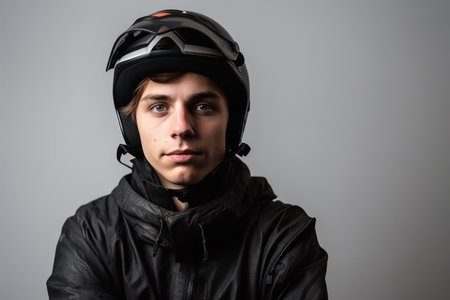 portrait of a motorcycle rider posing with a black helmet on a white background