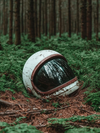 Lost astronaut helmet in a forest, a surreal scene of exploration and mystery.