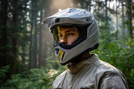 Young motocross rider wearing helmet and goggles standing in forest, ready for off road adventure