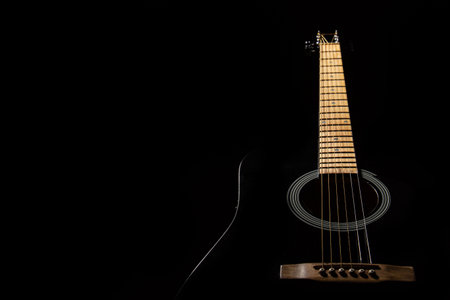 the guitar is black acoustic on a black background, silhouette. close-up, front view from below
