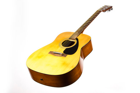 dreadnought six-string acoustic guitar made of light wood on a white background. an isolated object. close-up. with a place for the text. view from below