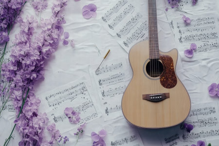 An acoustic guitar is placed among scattered sheet music and a tuning fork, adorned with soft purple flowers, creating an inspiring atmosphere.