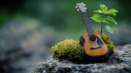 A wooden acoustic guitar rests against a sturdy tree trunk amidst a serene forest, creating a peaceful atmosphere perfect for relaxation and inspiration.