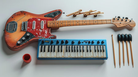 This creative flat lay features a variety of musical instruments including a guitar, keyboard, and drums, surrounded by music notes on a white background.