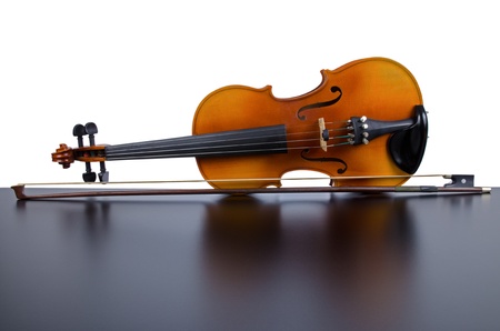 Violin on top of dark table partially isolated on white background.