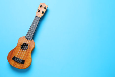 One ukulele on light blue background, top view. Space for text