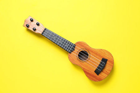 One ukulele on yellow background, top view