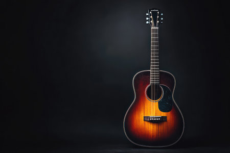 Elegant acoustic guitar standing alone against a black backdrop, symbolizing music, art, and classic string instruments.