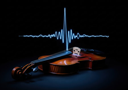 A conceptual image of a violin with a glowing blue sound wave, or waveform, rising from it. Representing the sound of music.