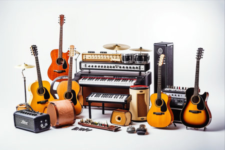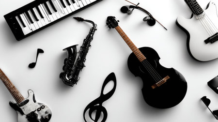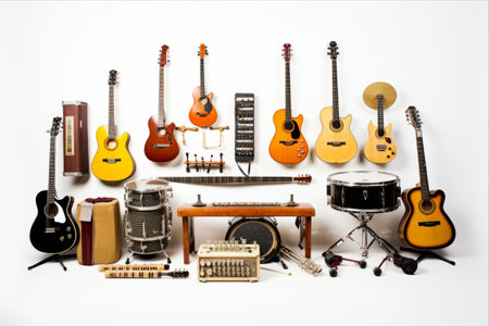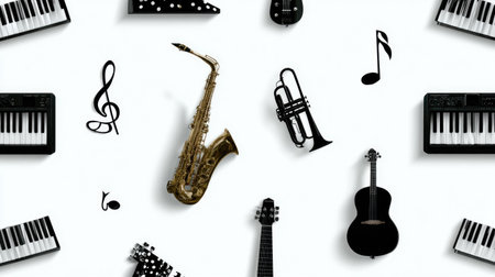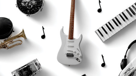 Collection of various musical instruments and notes arranged on a white background, perfect for showcasing creativity and artistry in music-related projects.