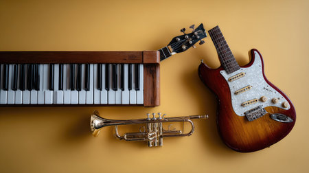 This image showcases an artistic arrangement of musical instruments on a vibrant yellow background. Featuring a guitar, piano, and trumpet, it embodies creativity and musicality. Ideal for projects related to music education, performances, or artistic expression.
