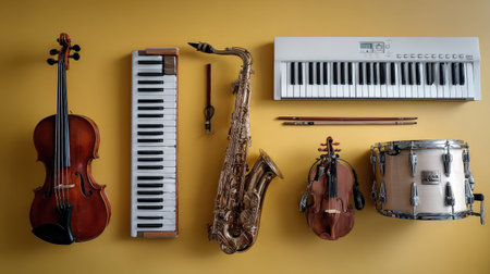 An aesthetically pleasing arrangement of musical instruments including a violin, saxophone, keyboard, and drums on a vibrant yellow background that captures the essence of creativity and expression in music.