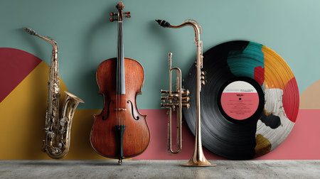 This striking image showcases a vibrant collection of musical instruments, including a saxophone, trumpet, and violin, alongside a colorful vinyl record.