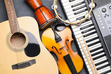 Different musical instruments on dark background, closeup