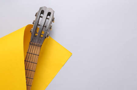 Acoustic guitar neck wrapped in yellow sheet of paper on gray background. musical concept. minimalism. top view. flat lay
