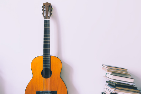 Orange acoustic guitar and a stack of books near the white wall. Tinted and filtered photo with a copy-space.