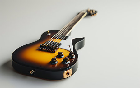 Electric guitar and musical instruments on a white background. Top view.