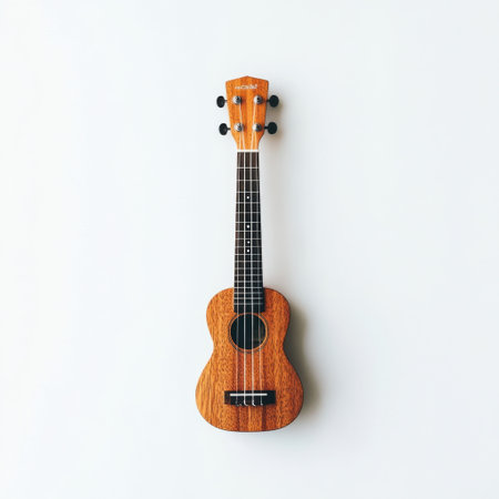 A small wooden ukulele showcases its rich grain and nylon strings, perfectly positioned against a light background, inviting music-making and creativity at any time.