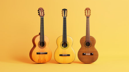 3D illustrated guitar set on yellow background. Classical guitar with pattern and one without.