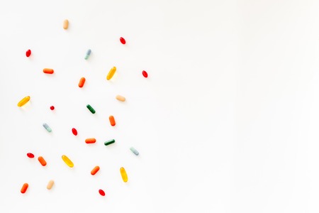 Colourful Sugar sprinkles, decoration for cake and ice-cream and cookies. Top view, Flat lay on white background.