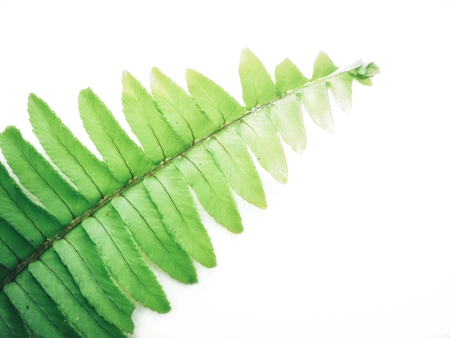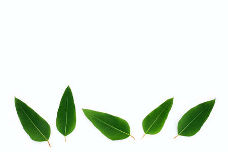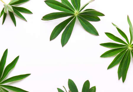 pattern of twigs, green leaves on a white background. Minimalistic natural concept. View from above, flat