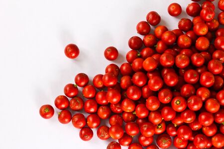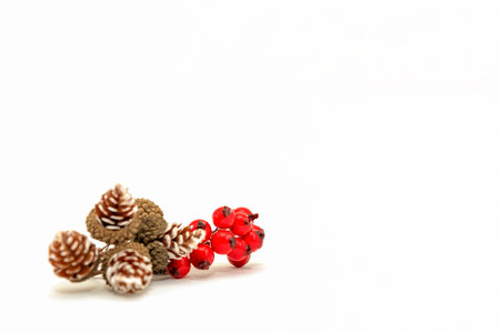 Christmas banner, isolate on white, cones and red berries are laid out on a white background. For print, postcard, design with place for text.