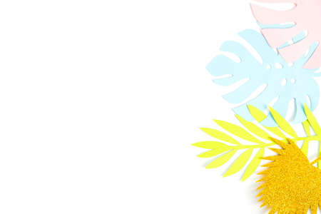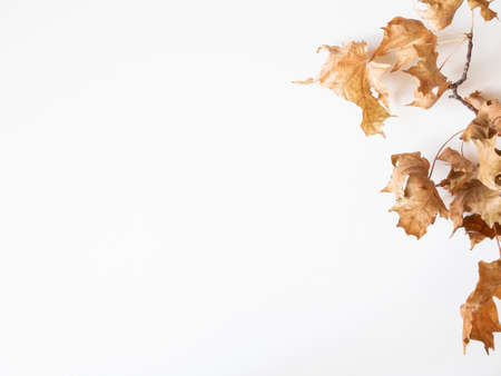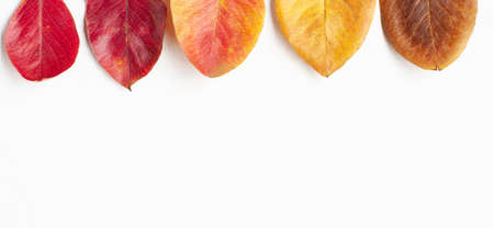 Banner flat lay top view of yellow, orange, brown, gold and red colors autumn leaves at the top of the image on white background with space for text