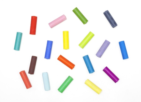 pieces of color chalk scattered on white backgrond, horizontal image with room for text