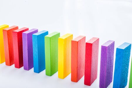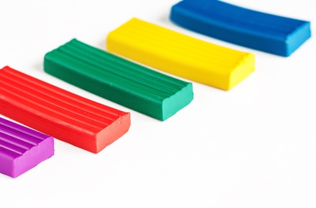 Colorful blocks made from plasticine clay are stacked staircase on white background