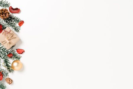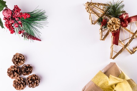 Minimal creative flat lay of christmas traditional composition and new year holiday season. Top view winter christmas decorations on white background with blank space for text. Copy space photography.