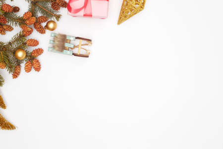 Creative flat lay of christmas traditional composition and new year holiday season. Top view winter christmas decoration on white background. Panoramic banner with copy space for text and Advertising.