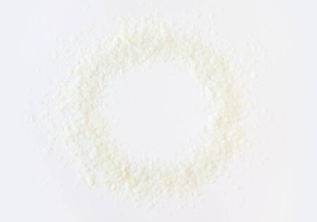 Scattered garlic powder on white background, garlic spice pattern and texture top view.