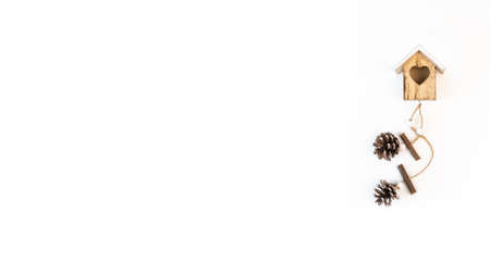 Cute wooden house model with hanging pinecone isolated on white background with copy space for text. Image for real estate concept. Decoration great for cards, banners, party posters, headers.