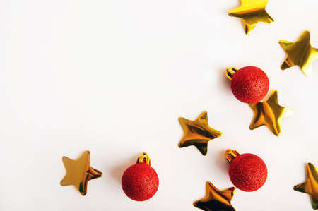 New Years background with red balls and yellow sparkles stars on white background. Flat lay christmas decor and copy space.