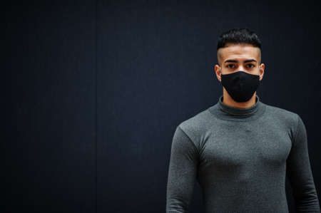 Middle eastern man in gray turtleneck and black face protect mask on isolated background.
