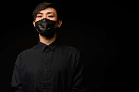 man in a medical mask on a black background, protection against coronavirus, disease prevention
