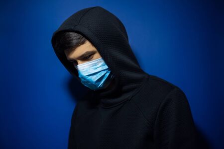 Studio portrait of teenage guy, wearing medical flu mask, dressed in hoodie sweater on background of dark blue color.