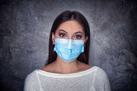 Girl in medical facemask. Masked woman looks at camera, concept for flu, virus, respiratory disease, quarantine. Beautiful caucasian young woman with disposable face mask