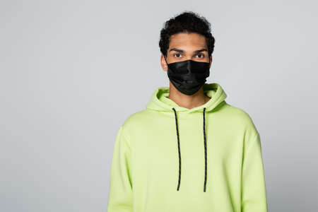african american man in green hoodie and black medical mask isolated on gray